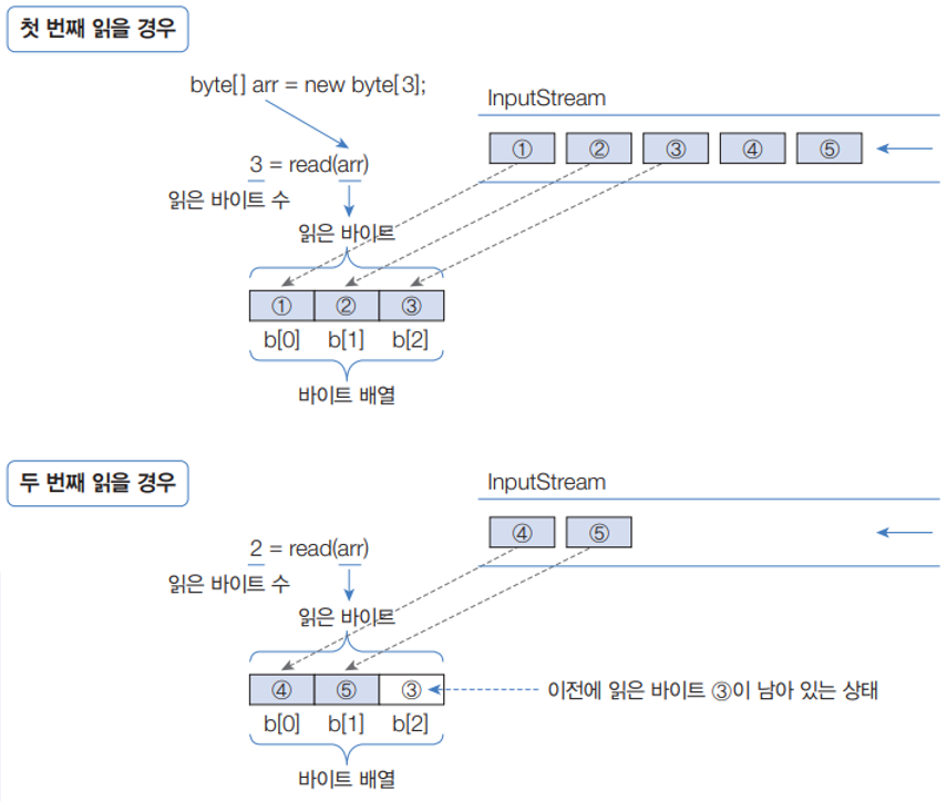 - read(byte[] b) 메소드 : 입력 스트림으로 부터 주어진 배열의 길이만큼 바이트를 읽고 배열에 저장한 다음, 읽은 바이트 수를 리턴합니다.