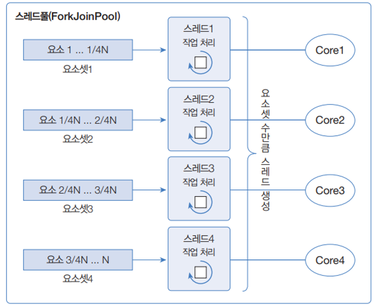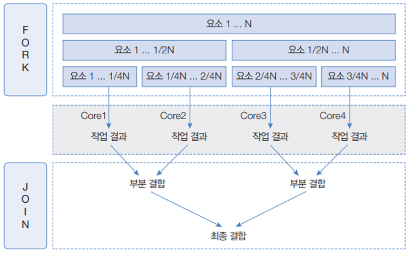 - 포크(Fork) 단계 : 전체요 소들을 서브 요소셋으로 분할하고, 각각의 서브 요소셋을 멀티 코어에서 병렬로 처리 합니다.