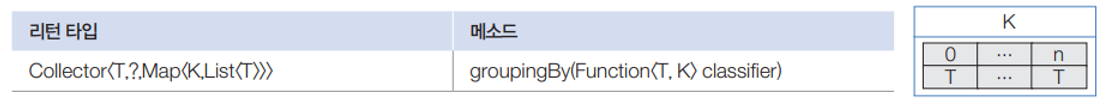 - groupingBy()는 Function을 이용하여 T를 K로 매핑하고, K를 키로해 List<T>를 값으로 갖는 Map 컬렉션을 생성합니다.