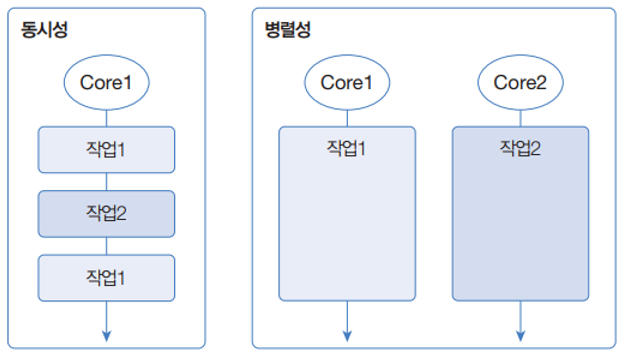- 병렬성 : 멀티 작업을 위해 멀티 코어를 각각 이용해서 병렬로 실행하는 것