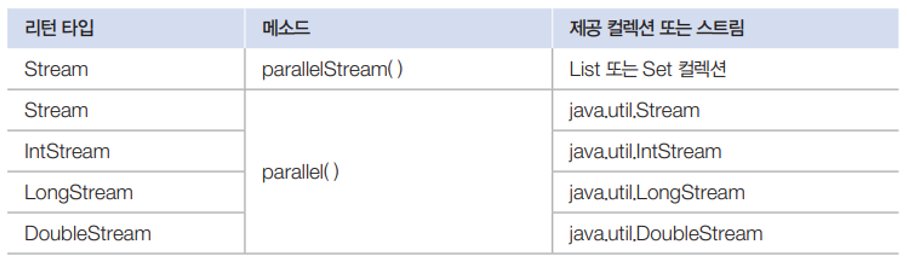 - parallelStream() 메소드는 컬렉션(List, Set)으로부터 병렬 스트림을 바로 리턴합니다.