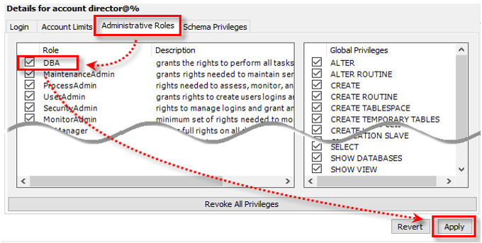 - [Administrative Roles]에서는 MySQL 자체에 대한 권한설정