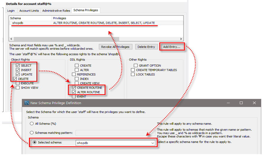 GRANT SELECT, INSERT, UPDATE, DELETE ON shopdb.* TO staff@'%';
