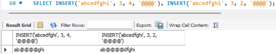 - INSERT(기준 문자열, 위치, 길이, 삽입할 문자열)