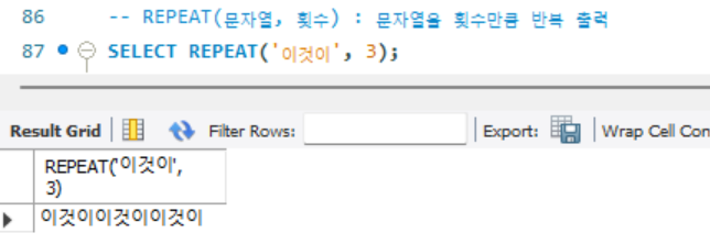 - REPEAT(문자열, 횟수) : 문자열을 횟수만큼 반복 출력