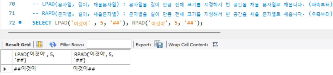 - LPAD(문자열, 길이, 채울 문자열), RPAD(문자열, 길이, 채울 문자열)