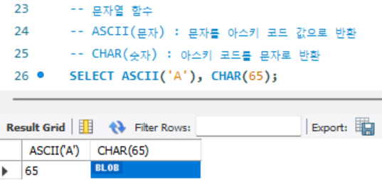- BIT_LENGTH(문자열), CHAR_LENGTH(문자열), LENGTH(문자열)