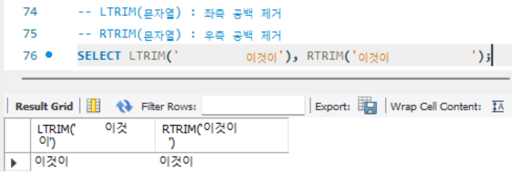 - TRIM(문자열) : 공백 제거 : 왼쪽, 오른쪽의 공백을 제거