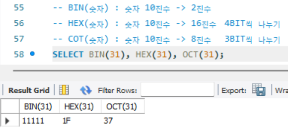 - BIN(숫자), HEX(숫자), OCT(숫자)