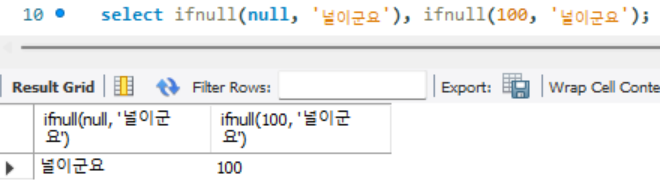 - 수식1이 NULL이 아니라면 수식1이 반환되고 수식1이 NULL이면 수식2가 반환됩니다.