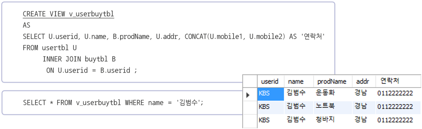 - 뷰를 생성한 후에는 테이블처럼 접근 가능하여 동일한 결과 얻을 수 있습니다.