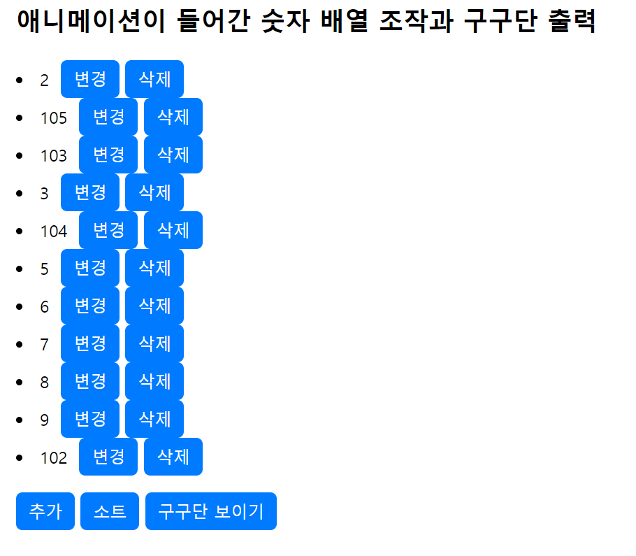 <h2>애니메이션이 들어간 숫자 배열 조작과 구구단 출력</h2>