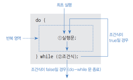 - 조건식이 true일때 반복실행하고, 조건식이 false 일때 do-while문을 종료합니다.