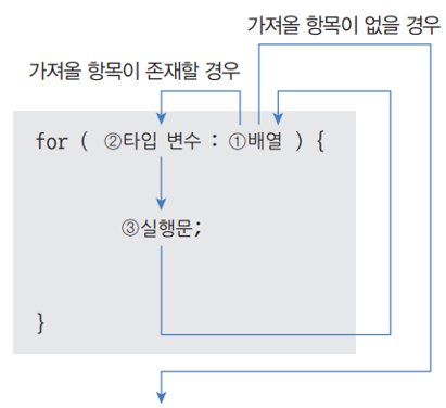 - 카운터 변수와 증감식을 사용하지 않고, 항목의 개수만큼 반복한후 자동으로 for문을 빠져 나갑니다.