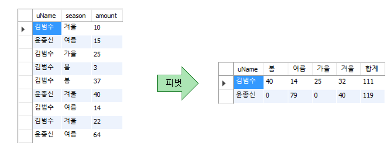 2023.02.07 - [MySQL] - MySQL의 데이터 형식-4(시스템 정보 함수).MySQL MySQL의 데이터 형식-4(시스템 정보 함수).MySQL 2023.02.07 - [MySQL] - MySQL의 데이터 형식-3(날짜 및 시간함수).MySQL MySQL의 데이터 형식-3(날짜 및 시간함수).MySQL 2023.02.07 - [MySQL] - MySQL의 데이터 형식-3(수학함수).MySQL MySQL의 데이터 형식-3(수학함수).My less-go.tistory.com 이전 글에서 계속됩니다. 피벗의 구현 피벗(PIVOT) 이란? 한 열에 포함된 여러 값을 출력, 이를 여러 열로 변환하여 테이블 반환식 회전, 필요하면 집계까지 수행합니다. use sqldb; create table piv..